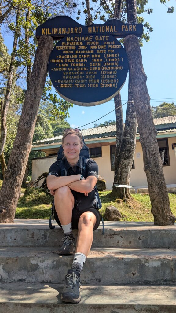 Erster Tag von unserer Kilimanjaro-Besteigung. Ich wache auf, als die ersten im Haus aktiv werden. Es ist 5:30 Uhr, aber ich bleibe noch liegen, da wir erst um 8 Uhr abgeholt werden. Wir haben noch ein abschließendes Frühstück gemeinsam mit Edwin und verabschieden uns. Es geht in die Stadt, wo wir jeden treffen, der uns bei der Besteigung helfen wird. 10 Träger, die im Moment noch unsere Sachen wiegen, da pro Träger maximal “nur” 20 kg zugelassen sind. Das heißt 200 kg Ausrüstung, Essen, Zelt, Matratzen, alles drum und dran. 9:15 kann es dann endlich losgehen. Der Minivan ist voll mit 2 Guides, 1 Fahrer, uns und den Träger. Wir fahren nun zum Machame-Gate und machen schon ordentlich Höhenmeter gut. Wie ein Wunder zeigt sich uns heute am ersten Tag unserer Besteigung das erste Mal der Kilimanjaro und das in voller Pracht. Es sieht aus, wie eine Fototapete, völlig unrealistisch. Aber er ist es, mein Kilimanjaro, auf den ich schon so lange rauf will. Und nun ist es so weit. Beim Machame Gate angekommen, müssen alle organisatorischen Dinge erledigt werden. Die Träger müssen sich in einer langen Reihe anstellen, um kontrollieren zu lassen, dass es wirklich nur 20 kg sind und wir müssen uns eintragen. Passnummer, Nationalität, Geschlecht, alter, alles wollen sie wissen. Wir bekommen unsere Lunch-Pakete zugeteilt und müssen etwas warten. Plastikflaschen sind im Park nicht erlaubt, also wird alles in Mehrwegflaschen umgefüllt. Auch unser Gepäck wird auf Drohnen, Plastiktüten, Waffen und weiteres durchsucht, aber dann ist irgenwann alles erledigt und 12:30 Uhr kann es losgehen. Heute stehen 11 km und 1000 Höhenmeter bevor. Wir laufen direkt von Anfang an im Regenwald. Ab und zu stoppen wir, da und Isaac eine Pflanze erklärt. Überall Farne, überall Moos. Alles ist schön grün. Leider liegt aber auch wirklich viel Bonbon-Plastikmüll herum. Die großen Dinge sammle ich ein, aber alles ist zu viel. Nicht jeder Gruppe ist so klein wie wir, im Gegenteil. Es gibt mehrere Truppen mit 10-20 Touristen. Jedes Mal, wenn eine Pause gemacht wird, bekommt man die ein oder andere Gruppe zu sehen. Eine Gruppe mit auch nur 3 Personen ist besonders bemerkenswert. Eine Mutter und ihre 2 Töchter. Die Töchter laufen barfuß, während ihre Mama nur noch 1 Bein hat. Am anderen trägt sie eine Protese. In ihren Händen sind keine Wanderstöcke sondern Gehhilfen. Alles ist möglich, wenn man nur will. Wir gehen hier über Stock und Stein, aber das ist einfach nur inspirierend. Wir staunen nicht schlecht. Unsere Guides geben ein Tempo an, was mir deutlich zu langsam ist. Ich weiß, dass man im Berg langsam machen muss, aber heute sind wir noch nicht wirklich hoch also können wir sie überreden, etwas schneller zu laufen. Wir sind ein gutes Team und heute verlief alles ohne Probleme. Am Camp angekommen, müssen wir uns noch mit allen Daten eintragen und wir können zum ersten Mal unser Camp inspizieren. Wie toll. Wir schlafen zu dritt auf unseren Wunsch, da es wärmer ist, in einem Zelt. Im Vorzelt steht unser Esstisch. Unsere Matratzen sind schon ausgerollt, unser Gepäck wartet auf uns. Jetzt müssen wir so schnell wie möglich unsere Kleidung wechseln. Raus aus der durcvgeschwitzten Kleidung rein in warme trockene Sachen, denn es wird ordentlich kalt. Und schon wird uns Tee, Popcorn und Erdnüsse serviert. Wir sitzen zusammen, lassen den Tag sacken und warten bis das Abendessen fertig ist. In der Zwischenzeit schauen wir noch ganz kurz den Sonnenuntergang an bis uns eine Gurkensuppe serviert wird. Das tut gut und wärmt. Zum Hautgang gibt es Bratkartoffeln, ein Mini-Stück Fisch und Salat. Das Desert kommt unerwartet, Obstspieße aus Wassermelone und Ananas. Nach dem Essen kommen Rahim und Isaac ins Zelt mit unserem medizinischen Zettel, der ausgefüllt werden muss. Dieser fungiert als Freifahrtschein, um den Weg ins nächste Camp anzugehen, sofern alles in Ordnung ist. Wie fühle ich mich auf einer Skala von 1-10, wie ist meine Sauerstoffsättigung, mein Puls, habe ich Übelkeit, Erbrechen, Durchfall, Schwindel, Kopfschmerzen oder Atemprobleme, also Anzeichen auf Höhenkrankheit und wie viel Wasser habe ich heute getrunken. Als alles ausgefüllt war, wurde noch kurz der morgige Tag besprochen und danach ging es ganz schnell nochmal auf Toilette und Zähne putzen, denn es ist auf einen Schlag extrem kalt geworden. Ich genieße noch 5 Minuten den Sternenhimmel, bevor ich zitternd zum Zelt zurück kehre. Also geht es besser schnell in die warmen Schlafsäcke.