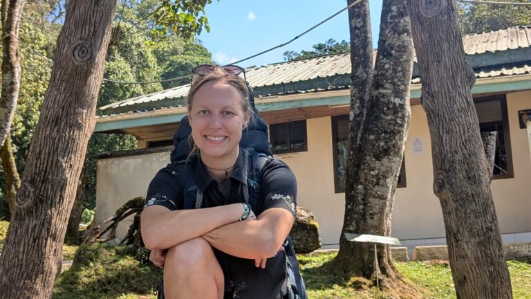 Erster Tag von unserer Kilimanjaro-Besteigung. Ich wache auf, als die ersten im Haus aktiv werden. Es ist 5:30 Uhr, aber ich bleibe noch liegen, da wir erst um 8 Uhr abgeholt werden. Wir haben noch ein abschließendes Frühstück gemeinsam mit Edwin und verabschieden uns. Es geht in die Stadt, wo wir jeden treffen, der uns bei der Besteigung helfen wird. 10 Träger, die im Moment noch unsere Sachen wiegen, da pro Träger maximal “nur” 20 kg zugelassen sind. Das heißt 200 kg Ausrüstung, Essen, Zelt, Matratzen, alles drum und dran. 9:15 kann es dann endlich losgehen. Der Minivan ist voll mit 2 Guides, 1 Fahrer, uns und den Träger. Wir fahren nun zum Machame-Gate und machen schon ordentlich Höhenmeter gut. Wie ein Wunder zeigt sich uns heute am ersten Tag unserer Besteigung das erste Mal der Kilimanjaro und das in voller Pracht. Es sieht aus, wie eine Fototapete, völlig unrealistisch. Aber er ist es, mein Kilimanjaro, auf den ich schon so lange rauf will. Und nun ist es so weit. Beim Machame Gate angekommen, müssen alle organisatorischen Dinge erledigt werden. Die Träger müssen sich in einer langen Reihe anstellen, um kontrollieren zu lassen, dass es wirklich nur 20 kg sind und wir müssen uns eintragen. Passnummer, Nationalität, Geschlecht, alter, alles wollen sie wissen. Wir bekommen unsere Lunch-Pakete zugeteilt und müssen etwas warten. Plastikflaschen sind im Park nicht erlaubt, also wird alles in Mehrwegflaschen umgefüllt. Auch unser Gepäck wird auf Drohnen, Plastiktüten, Waffen und weiteres durchsucht, aber dann ist irgenwann alles erledigt und 12:30 Uhr kann es losgehen. Heute stehen 11 km und 1000 Höhenmeter bevor. Wir laufen direkt von Anfang an im Regenwald. Ab und zu stoppen wir, da und Isaac eine Pflanze erklärt. Überall Farne, überall Moos. Alles ist schön grün. Leider liegt aber auch wirklich viel Bonbon-Plastikmüll herum. Die großen Dinge sammle ich ein, aber alles ist zu viel. Nicht jeder Gruppe ist so klein wie wir, im Gegenteil. Es gibt mehrere Truppen mit 10-20 Touristen. Jedes Mal, wenn eine Pause gemacht wird, bekommt man die ein oder andere Gruppe zu sehen. Eine Gruppe mit auch nur 3 Personen ist besonders bemerkenswert. Eine Mutter und ihre 2 Töchter. Die Töchter laufen barfuß, während ihre Mama nur noch 1 Bein hat. Am anderen trägt sie eine Protese. In ihren Händen sind keine Wanderstöcke sondern Gehhilfen. Alles ist möglich, wenn man nur will. Wir gehen hier über Stock und Stein, aber das ist einfach nur inspirierend. Wir staunen nicht schlecht. Unsere Guides geben ein Tempo an, was mir deutlich zu langsam ist. Ich weiß, dass man im Berg langsam machen muss, aber heute sind wir noch nicht wirklich hoch also können wir sie überreden, etwas schneller zu laufen. Wir sind ein gutes Team und heute verlief alles ohne Probleme. Am Camp angekommen, müssen wir uns noch mit allen Daten eintragen und wir können zum ersten Mal unser Camp inspizieren. Wie toll. Wir schlafen zu dritt auf unseren Wunsch, da es wärmer ist, in einem Zelt. Im Vorzelt steht unser Esstisch. Unsere Matratzen sind schon ausgerollt, unser Gepäck wartet auf uns. Jetzt müssen wir so schnell wie möglich unsere Kleidung wechseln. Raus aus der durcvgeschwitzten Kleidung rein in warme trockene Sachen, denn es wird ordentlich kalt. Und schon wird uns Tee, Popcorn und Erdnüsse serviert. Wir sitzen zusammen, lassen den Tag sacken und warten bis das Abendessen fertig ist. In der Zwischenzeit schauen wir noch ganz kurz den Sonnenuntergang an bis uns eine Gurkensuppe serviert wird. Das tut gut und wärmt. Zum Hautgang gibt es Bratkartoffeln, ein Mini-Stück Fisch und Salat. Das Desert kommt unerwartet, Obstspieße aus Wassermelone und Ananas. Nach dem Essen kommen Rahim und Isaac ins Zelt mit unserem medizinischen Zettel, der ausgefüllt werden muss. Dieser fungiert als Freifahrtschein, um den Weg ins nächste Camp anzugehen, sofern alles in Ordnung ist. Wie fühle ich mich auf einer Skala von 1-10, wie ist meine Sauerstoffsättigung, mein Puls, habe ich Übelkeit, Erbrechen, Durchfall, Schwindel, Kopfschmerzen oder Atemprobleme, also Anzeichen auf Höhenkrankheit und wie viel Wasser habe ich heute getrunken. Als alles ausgefüllt war, wurde noch kurz der morgige Tag besprochen und danach ging es ganz schnell nochmal auf Toilette und Zähne putzen, denn es ist auf einen Schlag extrem kalt geworden. Ich genieße noch 5 Minuten den Sternenhimmel, bevor ich zitternd zum Zelt zurück kehre. Also geht es besser schnell in die warmen Schlafsäcke.