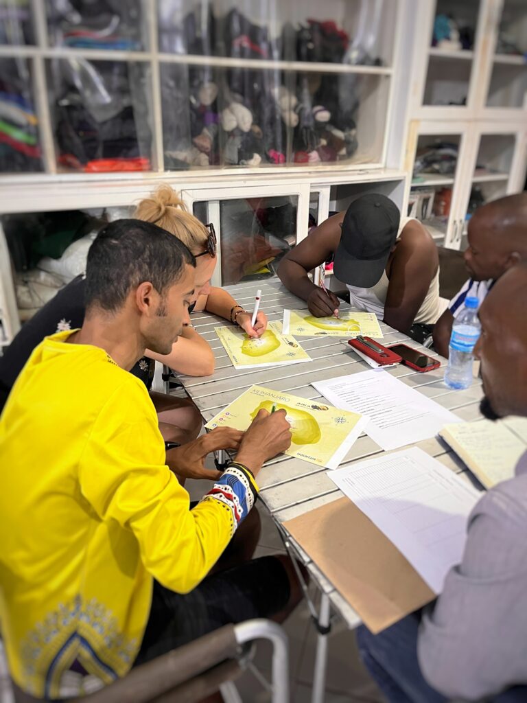 Heute stand alles im Sinne der Vorbereitung für unsere bevorstehende Kilimanjaro-Besteigung. Dementsprechend wurden heute mal wieder die Sachen gepackt, nur diesmal komplett anders. Mein Reise-Rucksack wird einmal komplett ausgeleert und dann nur mit dem nötigsten Wandersachen für die nächste Woche gepackt. Alles andere dürfen wir in unserer nächsten Unterkunft zwischenlagern. Als alles fertig gepackt ist, bekommen wir noch ein überraschendes Frühstück serviert, Chai und Brot. Nach der Verabschiedung stellen wir uns mit all unserem Sack und Pack vor die Haustür und hoffen auf ein vorbeifahrendes TukTuk, denn wir sind hier wirklich ziemlich weit weg vom Schuss. Gottseidank müssen wir nicht all zu lange warten. Wir werden bis zur nächsten Unterkunft gefahren, in der wir schlafen werden, wenn wir von unserer Wanderung zurück kommen. Laden die Sachen ab, bekommen noch Wanderstöcke in die Hand gedrückt und werden zum Busbahnhof gefahren. Dort angekommen verhandeln wir mit dem Busunternehmen, dass wir mit dürfen, auch wenn wir nicht all zu weit fahren wollen. Es geht nach Moshi. 3 Autostunden von Arusha entfernt, direkt am Fuße des Kilimanjaro. Die Fahrt ist Recht holprig und staubig. In Moshi angekommen, werden wir direkt freundlich von Edwin in Empfang genommen, unserem nächsten Gastgeber. Wir fahren direkt mal was zum Mittag essen, denn die Zeit ist ordentlich vergangen. Es gibt einheimisches Essen, Pilau, Reis mit Fleisch. Hiernach gehts kurz zu Edwin nach Hause. Eigentlich wollten wir unser Gepäck hier abladen, aber wir müssen alles zur späteren Vorbesprechung zur Kilimanjaro-Besteigung mitbringen, wurde uns erst jetzt gesagt. Also geht’s mit allem wieder in die Stadt, wo wir auf dem Second-Hand-Markt herausgelassen werden. Ein riesiger Markt von Holzbuden, auf denen Haufenweise Klamotten liegen. Wir wollen uns auf Kleinigkeiten fokussieren, Socken, Handschuhe, Mütze, Buff, alles sowas. Die Zeit vergeht. Wir finden einiges, aber nicht alles. Eine gute Regenjacke geht für 5€ über den Tisch. Ich bin begeistert von diesem Markt und finde es nun nochmal umso trauriger, dass mein Reisegepäck so klein ist. Als der Markt schließt, werden wir um 6 zur unserem Briefing, unserem Vorbereitungsgespräch und unserem Check der Ausrüstung abgeholt. Das Treffen sollte eigentlich um 11 Uhr statt finden. Ich musste etwas lachen, da das für uns völlig unrealistisch war. 18 Uhr war es dann also soweit. Wir trafen unsere Guides, die uns die nächsten 6 Tage begleiten und auf uns acht geben werden. Zunächst geht es daran, alles zu inspizieren, was wir mitgebracht haben. Danach wird eine Liste erstellt, mit Dingen, die wir brauchen und da das Treffen in einem Leihgeschäft für Wanderbekleidung stattfindet, können wir diese auch sofort anprobieren und das Chaos beginnt. Wir brauchen einfach noch zu viel und alles fliegt durcheinander. Aber am Ende landet doch alles in den großen Packtaschen und ich habe gottseidank einen der dicksten Schlafsäcke bekommen. Nun geht es noch an die eigentliche Besprechung. Wir bekommen jeder eine Karte in die Hand gedrückt und die Vorstellung der Route beginnt. Hier wird das heutige Foto des Tages geschossen. Alle 6 Tage werden durchgesprochen. Ich bin ja schon die ganze Zeit extrem euphorisch, aber jetzt schlägt es richtig zu. Ich sehe den Berg vor mir, auch wenn er sich bisher nicht gezeigt hat. Er war immer in den Wolken verschwunden. Jetzt Male ich mir ein Bild und was ich sehe ist einfach unglaublich. Die nächsten Tage werden spektakulär. Halb 10 sind wir endlich mit allem durch. Edwin steht schon vor der Tür und holt uns ab. Jetzt geht es noch schnell in den Supermarkt, ich brauche noch Sonnencreme und wir alle brauchen noch ein paar Weg-Snacks. Danach gibt es eine Überraschung. Die Schwester von Edwin hat uns Abendessen gekocht. Gemeinsam sitzen wir am Tisch und lassen den Tag ausklingen, heute ist mal wieder viel passiert, wir werden alle müde, aber bevor es ins Bett geht, muss ich unbedingt noch duschen, bevor es 6 Tage lang keine Dusche geben wird. Auch wenn die Dusche wieder nur ein Eimer mit heißem Wasser ist, fange ich an, diese Art der Dusche zu genießen. Einfach was Besonderes.