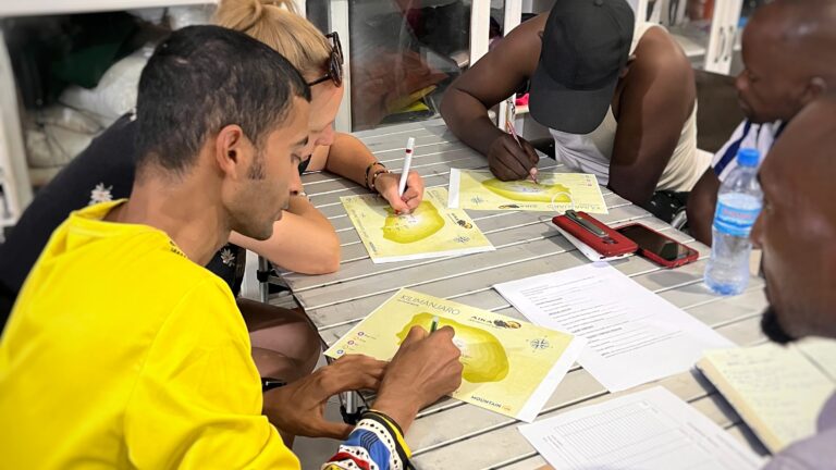 Heute stand alles im Sinne der Vorbereitung für unsere bevorstehende Kilimanjaro-Besteigung. Dementsprechend wurden heute mal wieder die Sachen gepackt, nur diesmal komplett anders. Mein Reise-Rucksack wird einmal komplett ausgeleert und dann nur mit dem nötigsten Wandersachen für die nächste Woche gepackt. Alles andere dürfen wir in unserer nächsten Unterkunft zwischenlagern. Als alles fertig gepackt ist, bekommen wir noch ein überraschendes Frühstück serviert, Chai und Brot. Nach der Verabschiedung stellen wir uns mit all unserem Sack und Pack vor die Haustür und hoffen auf ein vorbeifahrendes TukTuk, denn wir sind hier wirklich ziemlich weit weg vom Schuss. Gottseidank müssen wir nicht all zu lange warten. Wir werden bis zur nächsten Unterkunft gefahren, in der wir schlafen werden, wenn wir von unserer Wanderung zurück kommen. Laden die Sachen ab, bekommen noch Wanderstöcke in die Hand gedrückt und werden zum Busbahnhof gefahren. Dort angekommen verhandeln wir mit dem Busunternehmen, dass wir mit dürfen, auch wenn wir nicht all zu weit fahren wollen. Es geht nach Moshi. 3 Autostunden von Arusha entfernt, direkt am Fuße des Kilimanjaro. Die Fahrt ist Recht holprig und staubig. In Moshi angekommen, werden wir direkt freundlich von Edwin in Empfang genommen, unserem nächsten Gastgeber. Wir fahren direkt mal was zum Mittag essen, denn die Zeit ist ordentlich vergangen. Es gibt einheimisches Essen, Pilau, Reis mit Fleisch. Hiernach gehts kurz zu Edwin nach Hause. Eigentlich wollten wir unser Gepäck hier abladen, aber wir müssen alles zur späteren Vorbesprechung zur Kilimanjaro-Besteigung mitbringen, wurde uns erst jetzt gesagt. Also geht’s mit allem wieder in die Stadt, wo wir auf dem Second-Hand-Markt herausgelassen werden. Ein riesiger Markt von Holzbuden, auf denen Haufenweise Klamotten liegen. Wir wollen uns auf Kleinigkeiten fokussieren, Socken, Handschuhe, Mütze, Buff, alles sowas. Die Zeit vergeht. Wir finden einiges, aber nicht alles. Eine gute Regenjacke geht für 5€ über den Tisch. Ich bin begeistert von diesem Markt und finde es nun nochmal umso trauriger, dass mein Reisegepäck so klein ist. Als der Markt schließt, werden wir um 6 zur unserem Briefing, unserem Vorbereitungsgespräch und unserem Check der Ausrüstung abgeholt. Das Treffen sollte eigentlich um 11 Uhr statt finden. Ich musste etwas lachen, da das für uns völlig unrealistisch war. 18 Uhr war es dann also soweit. Wir trafen unsere Guides, die uns die nächsten 6 Tage begleiten und auf uns acht geben werden. Zunächst geht es daran, alles zu inspizieren, was wir mitgebracht haben. Danach wird eine Liste erstellt, mit Dingen, die wir brauchen und da das Treffen in einem Leihgeschäft für Wanderbekleidung stattfindet, können wir diese auch sofort anprobieren und das Chaos beginnt. Wir brauchen einfach noch zu viel und alles fliegt durcheinander. Aber am Ende landet doch alles in den großen Packtaschen und ich habe gottseidank einen der dicksten Schlafsäcke bekommen. Nun geht es noch an die eigentliche Besprechung. Wir bekommen jeder eine Karte in die Hand gedrückt und die Vorstellung der Route beginnt. Hier wird das heutige Foto des Tages geschossen. Alle 6 Tage werden durchgesprochen. Ich bin ja schon die ganze Zeit extrem euphorisch, aber jetzt schlägt es richtig zu. Ich sehe den Berg vor mir, auch wenn er sich bisher nicht gezeigt hat. Er war immer in den Wolken verschwunden. Jetzt Male ich mir ein Bild und was ich sehe ist einfach unglaublich. Die nächsten Tage werden spektakulär. Halb 10 sind wir endlich mit allem durch. Edwin steht schon vor der Tür und holt uns ab. Jetzt geht es noch schnell in den Supermarkt, ich brauche noch Sonnencreme und wir alle brauchen noch ein paar Weg-Snacks. Danach gibt es eine Überraschung. Die Schwester von Edwin hat uns Abendessen gekocht. Gemeinsam sitzen wir am Tisch und lassen den Tag ausklingen, heute ist mal wieder viel passiert, wir werden alle müde, aber bevor es ins Bett geht, muss ich unbedingt noch duschen, bevor es 6 Tage lang keine Dusche geben wird. Auch wenn die Dusche wieder nur ein Eimer mit heißem Wasser ist, fange ich an, diese Art der Dusche zu genießen. Einfach was Besonderes.