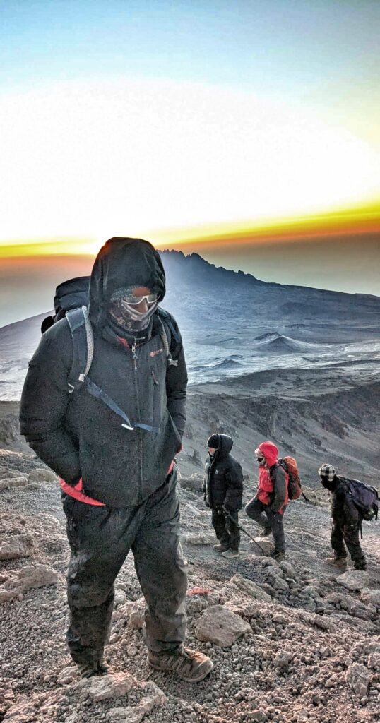 Der Wecker klingelt 23 Uhr. Der Plan war es um 12 los zu marschieren, bis Avi mit allem fertig ist, ist es 0:42. Zum “Frühstück” gebe ich Coca-Tee aus Südamerika aus. Ich habe mich wieder mit meinen Medikamenten aufgepeppelt. Es ist stockfinster Nacht. Vor uns zeichnet sich der Weg ab, durch die Wanderer die bereits gestartet sind und sich den Weg mit Stirnlampen kenntlich machen. Eine Schlange an Lichtern steigt den Berg hinauf. Der Sternenhimmel ist unglaublich schön, aber es ist bitter kalt. Wir starten mit unserer Tour. Im Schneckentempo geht es den steilen Berg herauf. Mit Ibuprofen fühle ich mich sehr gut. Die anderen beiden haben Probleme. Avi ist extrem schläfrig. Ich Versuche ihn anzutreiben, aber er hängt nur auf seinen Stöcken und kann keinen Meter weiter. Ich entferne den Schal vor seinem Mund, damit er mehr Sauerstoff bekommt und helfe ihm beim tiefen Atmen. Auch wenn die Luft und der Wind extrem kalt sind, wir müssen sie einatmen. Nach dem Ultimatum, dass ich Avi stelle: Du musst dich entscheiden, entweder hoch oder runter! Wir können hier nicht länger stehen bleiben, es ist zu kalt! Es sind etwa -20°C, aber der starke Wind macht es bestimmt zu -40°C. Avi entscheidet sich. Es geht bergauf. Im Nachhinein berichtet er mir, dass ihn nur meine Worte angetrieben haben. Die ganzen 10 Stunden bis hoch zum höchsten Punkt. In kleinen Stücken kämpfen wir uns voran. Wir laufen 45-60 Minuten und machen dann eine kurze Pause von 5 Minuten, verschnaufen, schnappen Luft, trinken unser eiskaltes Wasser und essen Snacks, um den Zuckerspiegel oben zu halten. Die Wasserflaschen lagern wir verkehrt herum in unseren Rucksäcken. Falls die Oberfläche einfriert, können wir so immer noch trinken, da es ja am Boden gefriert durch unsere Taktik. Mittlerweile tragen unsere Guides und Porter unser Gepäck. Zum Gipfel werden wir von Isack und Rahim unseren Guides und 2 Portern, den sogenannten summit Portern, Amin und Sadic, begleitet. Sie tragen Sauerstoff für den Notfall und sonstiges Notfallequipment. Allen ist angenehm nur mir ist durch mein Fieber bitter kalt. 2 Paar dicke Socken, 2 Paar Handschuhe, 3 Paar Hosen und 6 Schichten für meinen Oberkörper reichen nicht aus. Gottseidank haben wir noch eine Daunenjacke, die ich noch anziehen kann. Wie ein kleines Michelin-Männchen steige ich herauf, versuche wie ein Segel im Wind dagegen anzukommen. Nach 8 Stunden laufen lässt die Wirkung meiner Medikamente nach. Ich fühle mich nicht nur elend, auch meine Lunge tut extrem weh. Meine Bronchitis macht es mir doppelt schwer. 3 Punkte schmerzen so sehr, dass ich Angst habe. Langfristige schäden davon zu tragen. Meine Atemfrequenz ist stark erhöht. Ich stehe hier ruhig. Wenn wir laufen, schaffe ich eine Fußlänge in 3 Sekunden. Jeder Schritt ist eine neue Herausforderung. Der Sonnenaufgang bringt kurze Hoffnung.  Kurz vorm Stella point entscheide ich abzusteigen. Der Stella Point ist oben auf dem Krater Rand. Gehe ich noch die paar Meter? Nein! Meine Gesundheit ist mir wichtiger. Die Lunge Schmerz zu sehr. Ich bin nicht mal höhenkrank. Ich ärgere mich. Seit 6 Jahren möchte ich hier hoch und nun, dass ich hier bin, bin ich krank. Ich atme etwa 100 Mal pro Minute. Ich setze mich kurz hin, plötzlich wird mir übel und ich muss mich übergeben. Die Entscheidung steht: Isack steigt mit mir ab. Dass ich so weit gekommen bin, ist ein Wunder. Jeder bewundert mich, doch ich bin enttäuscht. Ich werde noch einige Tage brauchen, um meine Leistung zu akzeptieren und Wert zu schätzen. Andere haben ohne Fieber und mit gesunder Lunge schon 2 Tage vorher aufgegeben. Ich bin bis zum Kraterrand gekommen. Die beiden Jungs gehen weiter. Sie kämpfen sich noch bis zum Wegzeichen durch. Für mich geht es jetzt im tiefen Schotter senkrecht zum Hang den Berg hinab. Isack möchte mich tragen. Das kommt für mich absolut nicht in Frage. Er meint, wir müssen schnell absteigen, aber ich versuche ihm zu erklären, dass ich nicht höhenkrank bin und langsam machen muss. Nach 20 m Abstieg brauche ich eine Pause, da ich völlig außer Atem bin. An uns laufen so viele Leute vorbei, die höhenkrank geworden sind und wie besoffen gar nicht mehr bei sich sind. Bei mir ist es nur meine Bronchitis. Ich bin ganz hier im Moment und auch Isack realisiert langsam, dass ich anders bin. Wir steigen also in aller Ruhe ab. Wir genießen die Ruhe, die Zeit und teilen unsere Snacks mit anderen, die völlig geschafft sind. Mit mehr Ruhe und mehr Abstieg geht’s mir immer besser. Der Wind lässt auch langsam nach und die Sonne wärmt mich und ich ziehe eine Jacke nach der nächsten aus. Unten am Camp angekommen darf ich mich kurz ins Zelt legen. Ich schlafe sofort ein. Wir sind immer noch sehr hoch, aber Isack hat verstanden, dass ich einfach nur ruhen muss. Ich werde geweckt, es gibt Mittag. Es gibt eine Pizza, die in der Pfanne gebraten wurde, ich bin begeistert. Nachdem der Magen voll ist, kann ich endlich wieder eine Ibuprofen nehmen. Mit dessen Wirkung geht’s wie ein neuer Mensch weiter. Wir steigen weiter ab zum Millenium-Camp auf 3900 m. Wir lassen uns extrem viel Zeit. Wir bleiben ab und zu stehen und unterhalten uns über dies und das. Das Wetter ist nun angenehm, die Sonne wärmt uns. Ich hoffe dass es den Jungs gut geht. Die Hubschrauber fliegen unentwegt. Alles ist wie ein Traum. Mir geht es gut, auch wenn ich extrem viel Schleim abhuste. Als wir am Millenium-Camp ankommen, bauen wir gemeinsam das Zelt auf. Die Jungs müssen Mittag in dem anderen Zelt im anderen Camp essen, damit ich hier unten mich schon mal wieder hinlegen kann. Ich schlafe die gesamte Zeit. Ab und zu schaut Isack nach mir, um sich zu vergewissern, dass alles in Ordnung ist. Als ich wach werde, ist es bereits dunkel, die beiden sind immer noch nicht da. Langsam mache ich mir Sorgen. Aber von den Portern wird mir gesagt, dass sie im Barafu-Camp angekommen sind. Als die beiden im Millenium-Camp ankommen, sind sie völlig erschöpft und fal