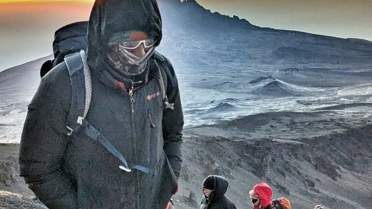 Der Wecker klingelt 23 Uhr. Der Plan war es um 12 los zu marschieren, bis Avi mit allem fertig ist, ist es 0:42. Zum “Frühstück” gebe ich Coca-Tee aus Südamerika aus. Ich habe mich wieder mit meinen Medikamenten aufgepeppelt. Es ist stockfinster Nacht. Vor uns zeichnet sich der Weg ab, durch die Wanderer die bereits gestartet sind und sich den Weg mit Stirnlampen kenntlich machen. Eine Schlange an Lichtern steigt den Berg hinauf. Der Sternenhimmel ist unglaublich schön, aber es ist bitter kalt. Wir starten mit unserer Tour. Im Schneckentempo geht es den steilen Berg herauf. Mit Ibuprofen fühle ich mich sehr gut. Die anderen beiden haben Probleme. Avi ist extrem schläfrig. Ich Versuche ihn anzutreiben, aber er hängt nur auf seinen Stöcken und kann keinen Meter weiter. Ich entferne den Schal vor seinem Mund, damit er mehr Sauerstoff bekommt und helfe ihm beim tiefen Atmen. Auch wenn die Luft und der Wind extrem kalt sind, wir müssen sie einatmen. Nach dem Ultimatum, dass ich Avi stelle: Du musst dich entscheiden, entweder hoch oder runter! Wir können hier nicht länger stehen bleiben, es ist zu kalt! Es sind etwa -20°C, aber der starke Wind macht es bestimmt zu -40°C. Avi entscheidet sich. Es geht bergauf. Im Nachhinein berichtet er mir, dass ihn nur meine Worte angetrieben haben. Die ganzen 10 Stunden bis hoch zum höchsten Punkt. In kleinen Stücken kämpfen wir uns voran. Wir laufen 45-60 Minuten und machen dann eine kurze Pause von 5 Minuten, verschnaufen, schnappen Luft, trinken unser eiskaltes Wasser und essen Snacks, um den Zuckerspiegel oben zu halten. Die Wasserflaschen lagern wir verkehrt herum in unseren Rucksäcken. Falls die Oberfläche einfriert, können wir so immer noch trinken, da es ja am Boden gefriert durch unsere Taktik. Mittlerweile tragen unsere Guides und Porter unser Gepäck. Zum Gipfel werden wir von Isack und Rahim unseren Guides und 2 Portern, den sogenannten summit Portern, Amin und Sadic, begleitet. Sie tragen Sauerstoff für den Notfall und sonstiges Notfallequipment. Allen ist angenehm nur mir ist durch mein Fieber bitter kalt. 2 Paar dicke Socken, 2 Paar Handschuhe, 3 Paar Hosen und 6 Schichten für meinen Oberkörper reichen nicht aus. Gottseidank haben wir noch eine Daunenjacke, die ich noch anziehen kann. Wie ein kleines Michelin-Männchen steige ich herauf, versuche wie ein Segel im Wind dagegen anzukommen. Nach 8 Stunden laufen lässt die Wirkung meiner Medikamente nach. Ich fühle mich nicht nur elend, auch meine Lunge tut extrem weh. Meine Bronchitis macht es mir doppelt schwer. 3 Punkte schmerzen so sehr, dass ich Angst habe. Langfristige schäden davon zu tragen. Meine Atemfrequenz ist stark erhöht. Ich stehe hier ruhig. Wenn wir laufen, schaffe ich eine Fußlänge in 3 Sekunden. Jeder Schritt ist eine neue Herausforderung. Der Sonnenaufgang bringt kurze Hoffnung.  Kurz vorm Stella point entscheide ich abzusteigen. Der Stella Point ist oben auf dem Krater Rand. Gehe ich noch die paar Meter? Nein! Meine Gesundheit ist mir wichtiger. Die Lunge Schmerz zu sehr. Ich bin nicht mal höhenkrank. Ich ärgere mich. Seit 6 Jahren möchte ich hier hoch und nun, dass ich hier bin, bin ich krank. Ich atme etwa 100 Mal pro Minute. Ich setze mich kurz hin, plötzlich wird mir übel und ich muss mich übergeben. Die Entscheidung steht: Isack steigt mit mir ab. Dass ich so weit gekommen bin, ist ein Wunder. Jeder bewundert mich, doch ich bin enttäuscht. Ich werde noch einige Tage brauchen, um meine Leistung zu akzeptieren und Wert zu schätzen. Andere haben ohne Fieber und mit gesunder Lunge schon 2 Tage vorher aufgegeben. Ich bin bis zum Kraterrand gekommen. Die beiden Jungs gehen weiter. Sie kämpfen sich noch bis zum Wegzeichen durch. Für mich geht es jetzt im tiefen Schotter senkrecht zum Hang den Berg hinab. Isack möchte mich tragen. Das kommt für mich absolut nicht in Frage. Er meint, wir müssen schnell absteigen, aber ich versuche ihm zu erklären, dass ich nicht höhenkrank bin und langsam machen muss. Nach 20 m Abstieg brauche ich eine Pause, da ich völlig außer Atem bin. An uns laufen so viele Leute vorbei, die höhenkrank geworden sind und wie besoffen gar nicht mehr bei sich sind. Bei mir ist es nur meine Bronchitis. Ich bin ganz hier im Moment und auch Isack realisiert langsam, dass ich anders bin. Wir steigen also in aller Ruhe ab. Wir genießen die Ruhe, die Zeit und teilen unsere Snacks mit anderen, die völlig geschafft sind. Mit mehr Ruhe und mehr Abstieg geht’s mir immer besser. Der Wind lässt auch langsam nach und die Sonne wärmt mich und ich ziehe eine Jacke nach der nächsten aus. Unten am Camp angekommen darf ich mich kurz ins Zelt legen. Ich schlafe sofort ein. Wir sind immer noch sehr hoch, aber Isack hat verstanden, dass ich einfach nur ruhen muss. Ich werde geweckt, es gibt Mittag. Es gibt eine Pizza, die in der Pfanne gebraten wurde, ich bin begeistert. Nachdem der Magen voll ist, kann ich endlich wieder eine Ibuprofen nehmen. Mit dessen Wirkung geht’s wie ein neuer Mensch weiter. Wir steigen weiter ab zum Millenium-Camp auf 3900 m. Wir lassen uns extrem viel Zeit. Wir bleiben ab und zu stehen und unterhalten uns über dies und das. Das Wetter ist nun angenehm, die Sonne wärmt uns. Ich hoffe dass es den Jungs gut geht. Die Hubschrauber fliegen unentwegt. Alles ist wie ein Traum. Mir geht es gut, auch wenn ich extrem viel Schleim abhuste. Als wir am Millenium-Camp ankommen, bauen wir gemeinsam das Zelt auf. Die Jungs müssen Mittag in dem anderen Zelt im anderen Camp essen, damit ich hier unten mich schon mal wieder hinlegen kann. Ich schlafe die gesamte Zeit. Ab und zu schaut Isack nach mir, um sich zu vergewissern, dass alles in Ordnung ist. Als ich wach werde, ist es bereits dunkel, die beiden sind immer noch nicht da. Langsam mache ich mir Sorgen. Aber von den Portern wird mir gesagt, dass sie im Barafu-Camp angekommen sind. Als die beiden im Millenium-Camp ankommen, sind sie völlig erschöpft und fal